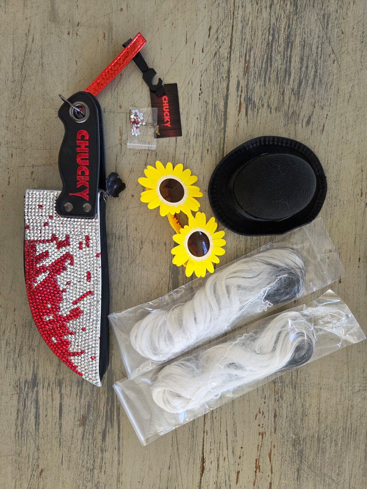 Includes custom dress, hat, 2 hairpiece, glasses, and bloody knife purse. Paid well over $300!